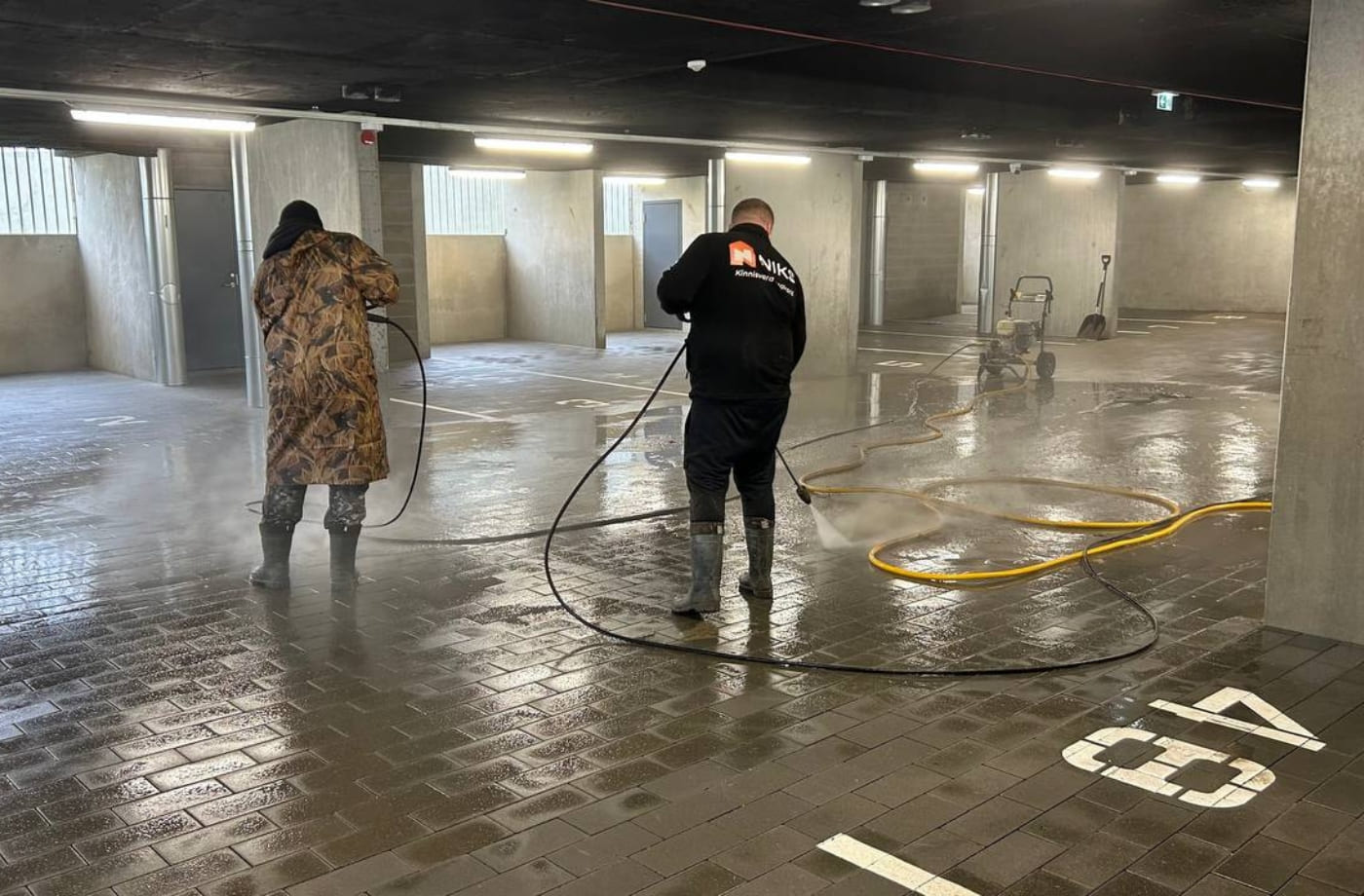 Garaažide ja parklate puhastus — põrandate, rampide ja märgistuse masinpesu